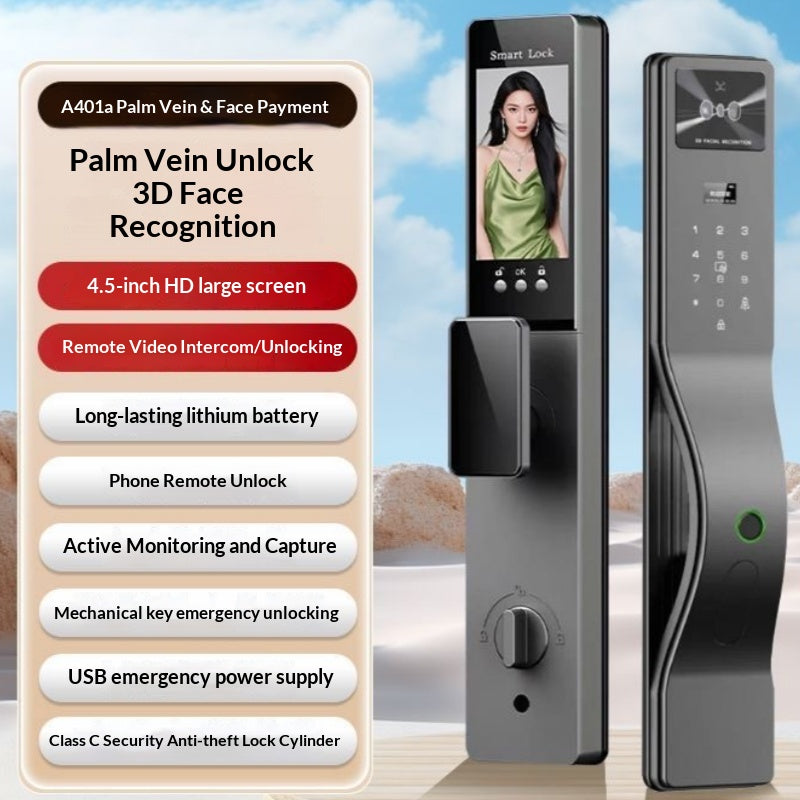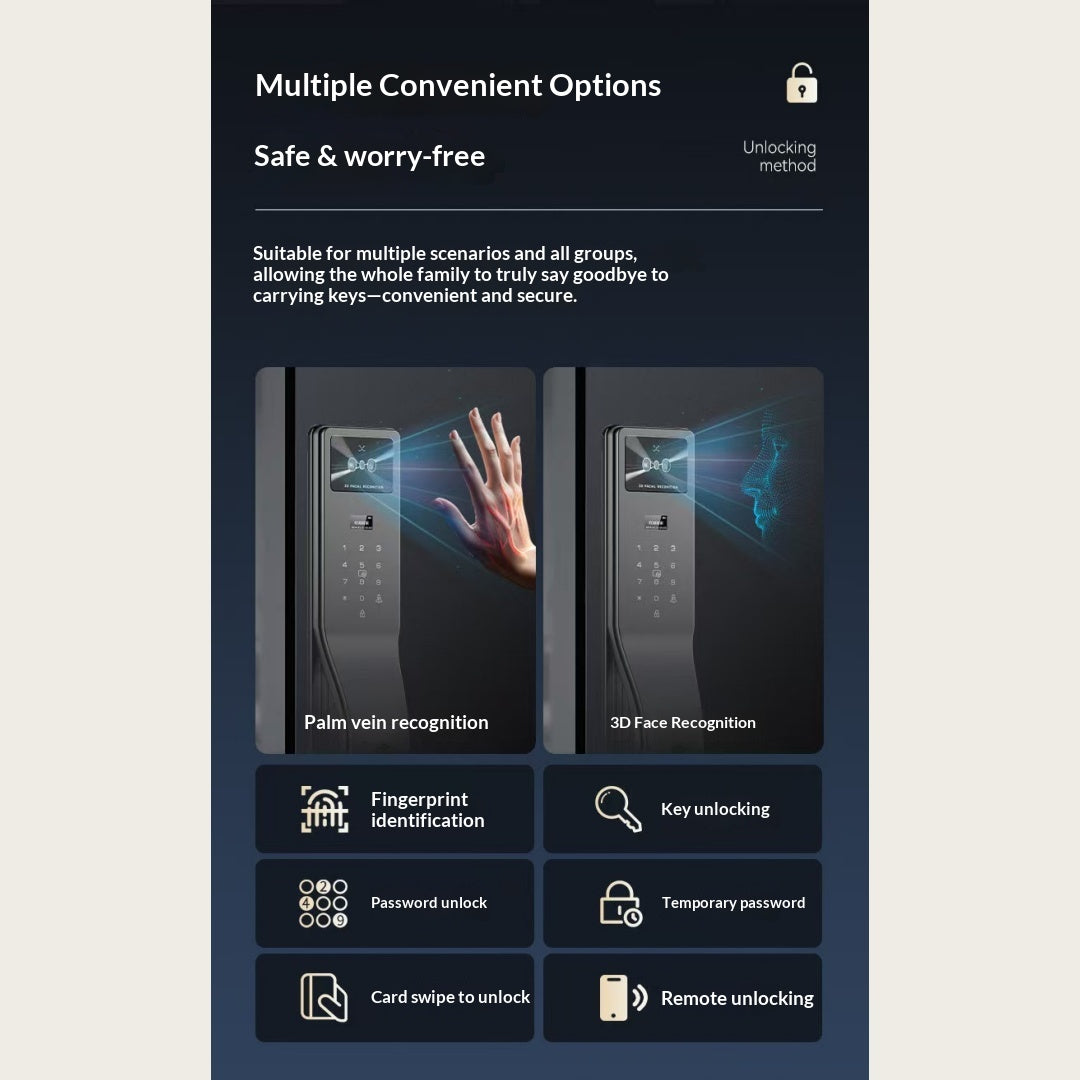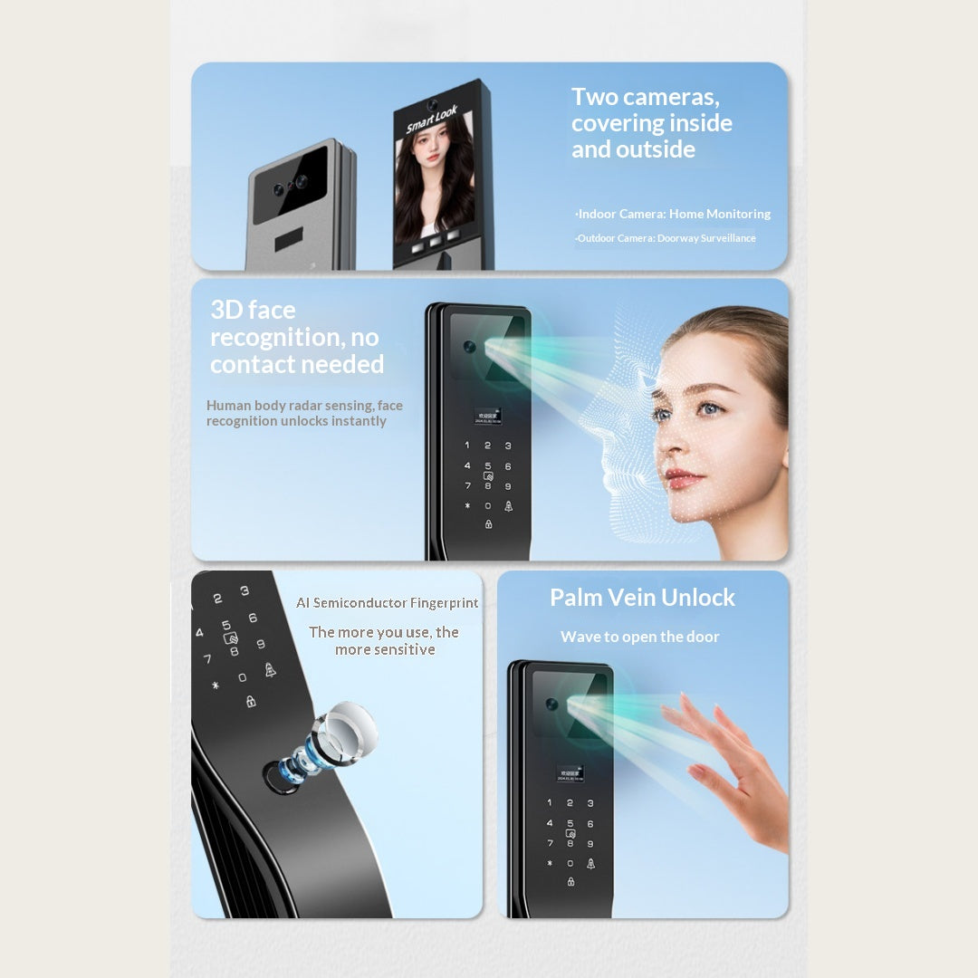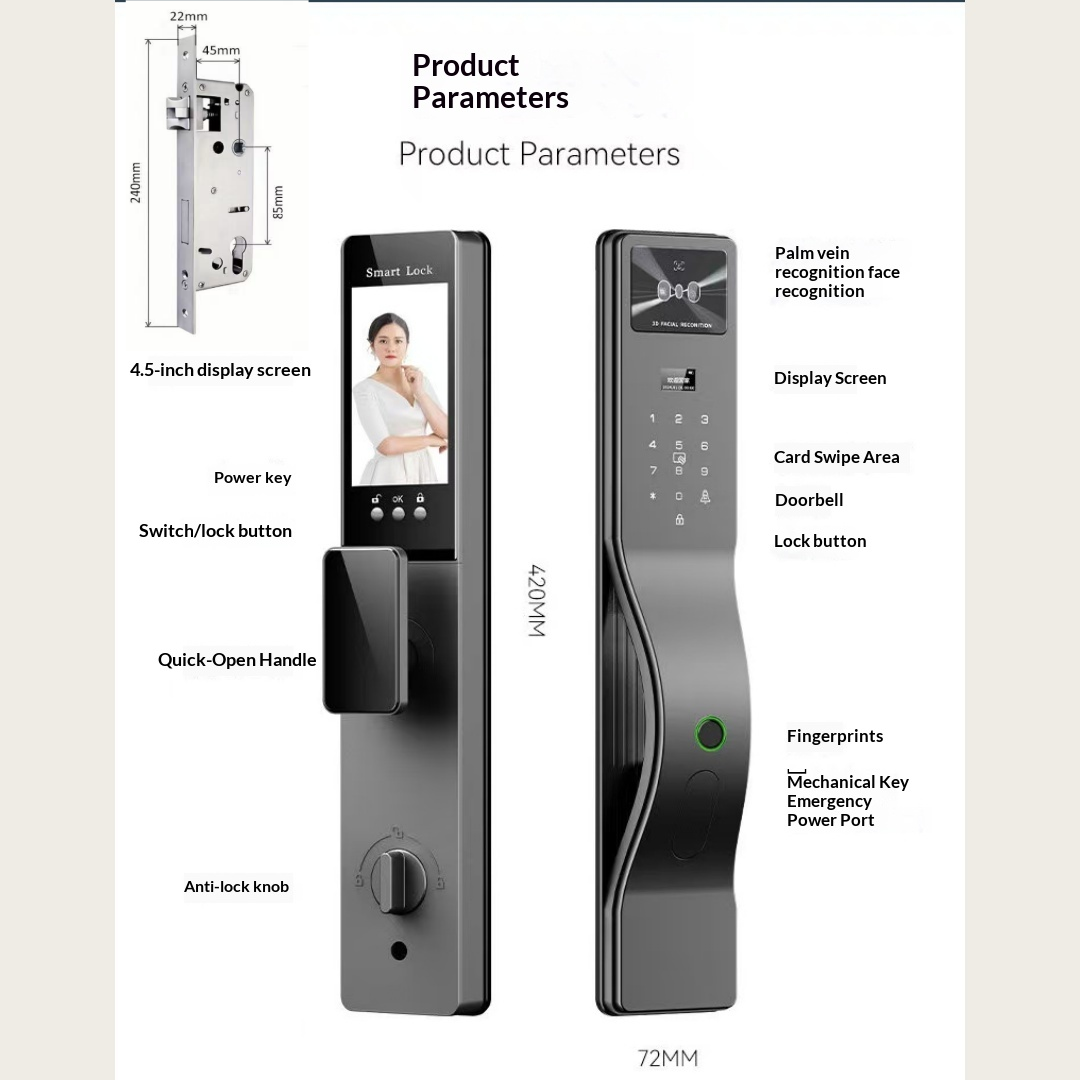 Fully Automatic 3D Face Smart Door Lock – Palm Vein + Fingerprint + IC Card + App + PIN + Key, HD Screen Real‑Time Monitoring, Abnormal Alarm, Fits Saudi Standard 4585 Mortise Lock Body